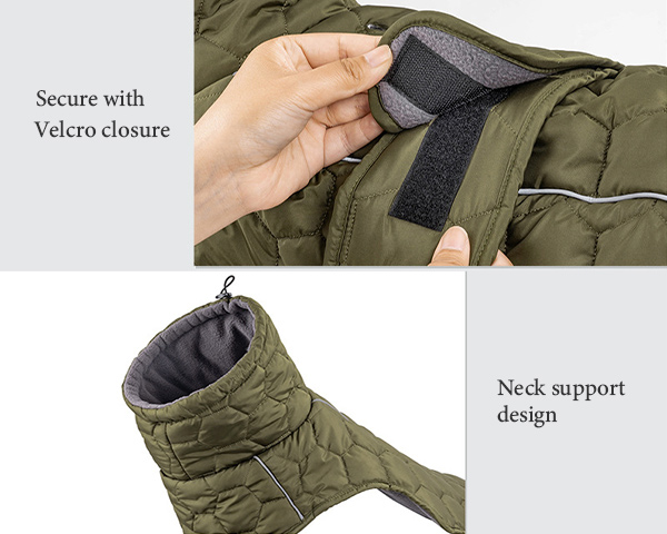 Thick insulated fabric keeps your dog warm, with an adjustable drawstring or Velcro neck guard for a snug, comfortable fit.