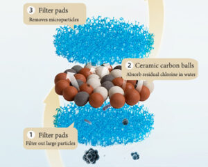 多層ろ過システム- パーティクルと塩素を除去し、水をきれいにします。.