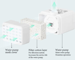 メッシュカバーとフィルターコットン層で、不純物を効果的にブロックし、ポンプの寿命を延ばします。静音ポンプを採用し、静かな環境でペットに新鮮な水を供給します。.