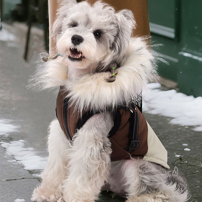 This winter dog jacket features a cozy fleece lining and a hood to keep small dogs warm during cold seasons. Perfect for Teddy, Bichon, and other small breeds, it combines comfort, warmth, and style for outdoor walks and activities.
